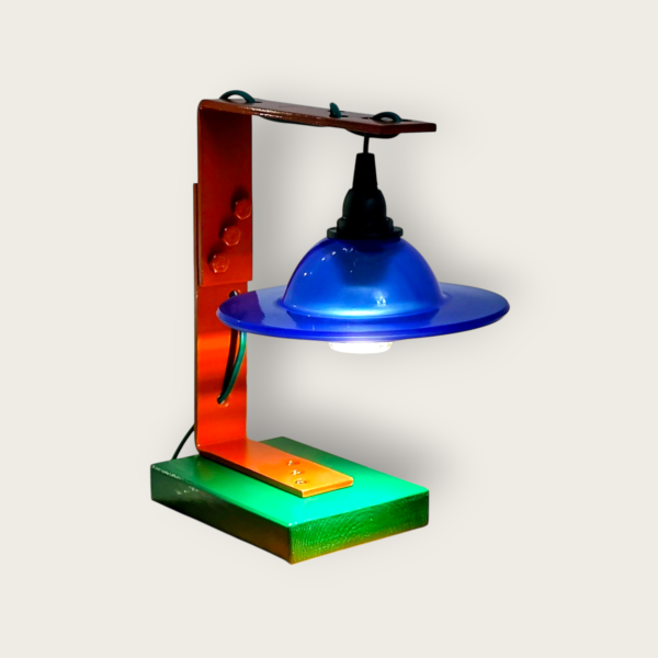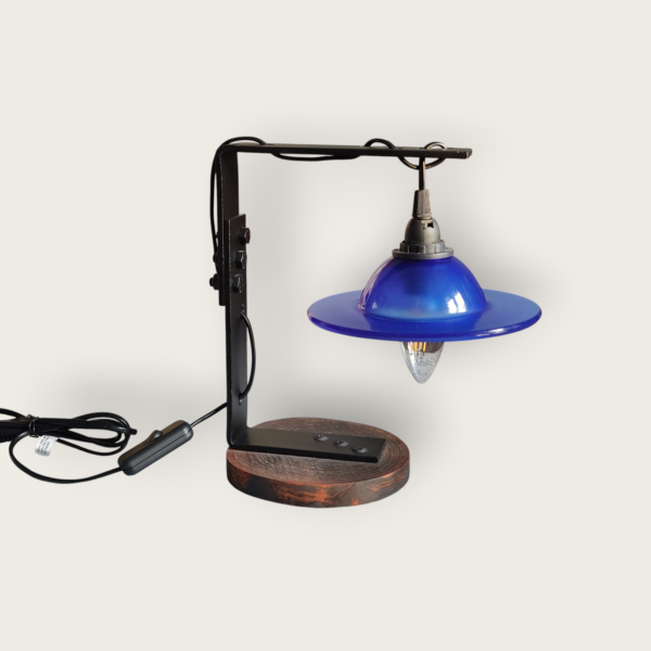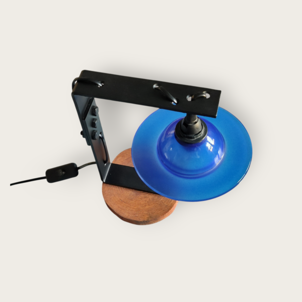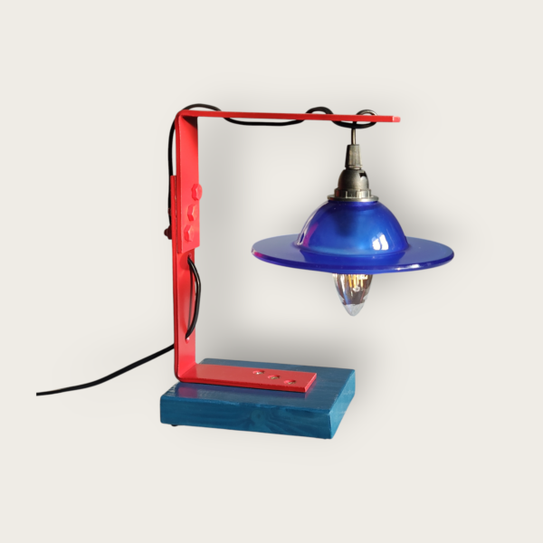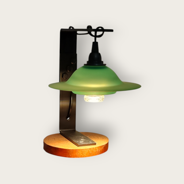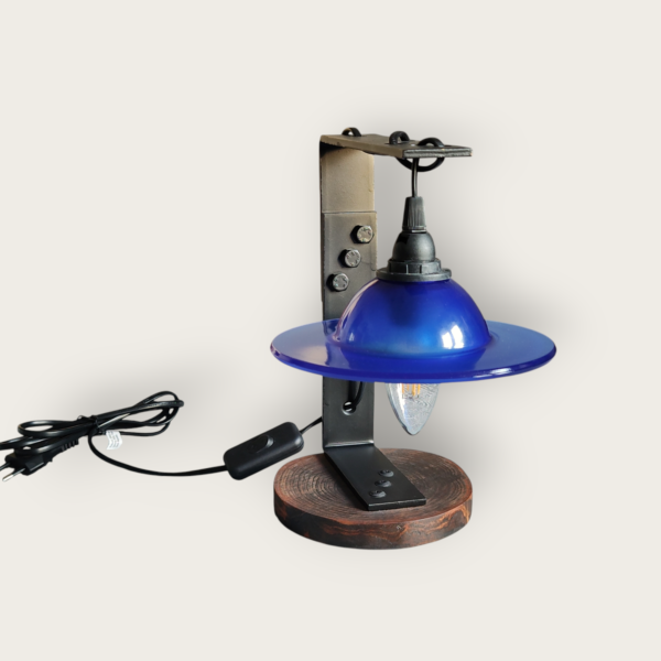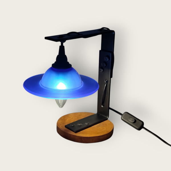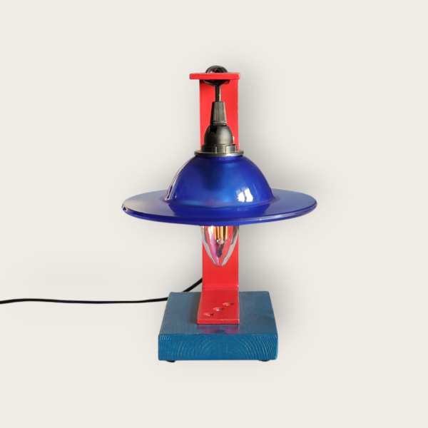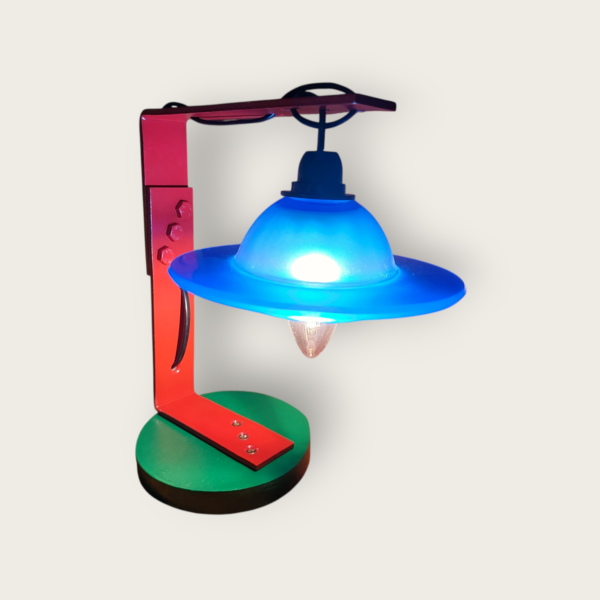 To nowoczesna hybryda z dominującym stylem space age – przez formę, kolor i skojarzenia z retro-futurystycznym designem. Jest współczesną reinterpretacją klasyki lat 60. Jej design przypomina kształtem latający spodek 🛸 – szczególnie przez niebieską lub zieloną kopułę i wystającą żarówkę w kształcie „silnika”. Cechuje ją industrialny styl ramy – czarny metalowy stelaż z widocznymi śrubami i przewodem, dodając charakteru typu loft. Podstawa z drewna (krążek lub prostokątny blok) ładnie kontrastuje z metalem, wprowadzając ciepły, naturalny akcent. Nietypowy klosz – półprzezroczyste szkło w formie przypominającej UFO – to prawdziwy wyróżnik. Eksponowane źródło światła wygląda jak nowoczesna wersja żarówki typu Edison.